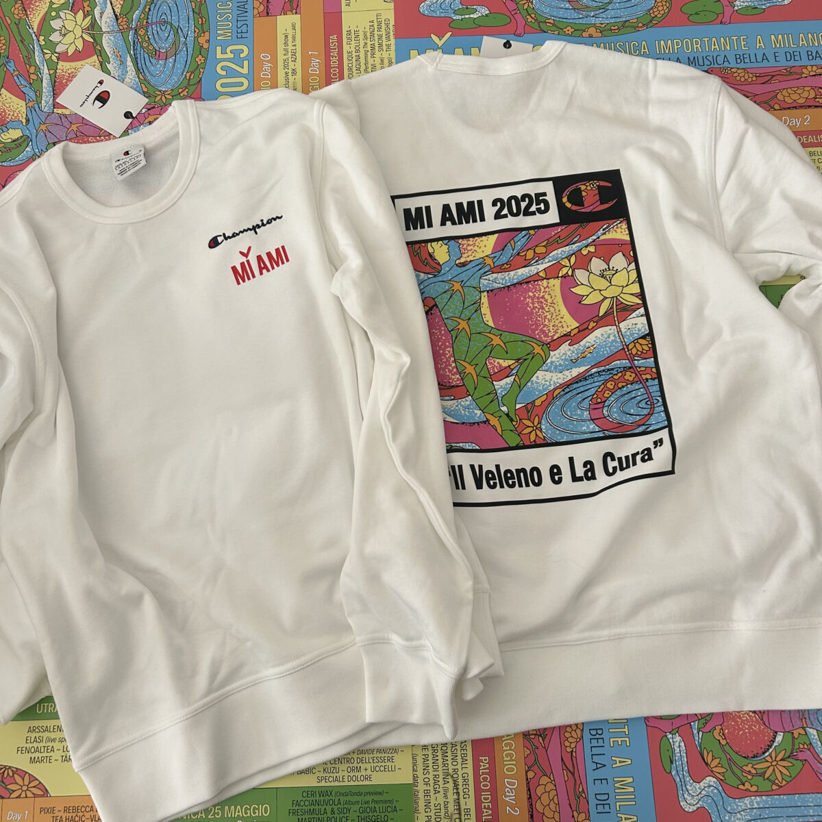 La collezione limitata CHAMPION X MI AMI 2025, con i loghi (davanti) e la grafica realizzata esclusivamente per la collezione “il Veleno e la Cura” (dietro).